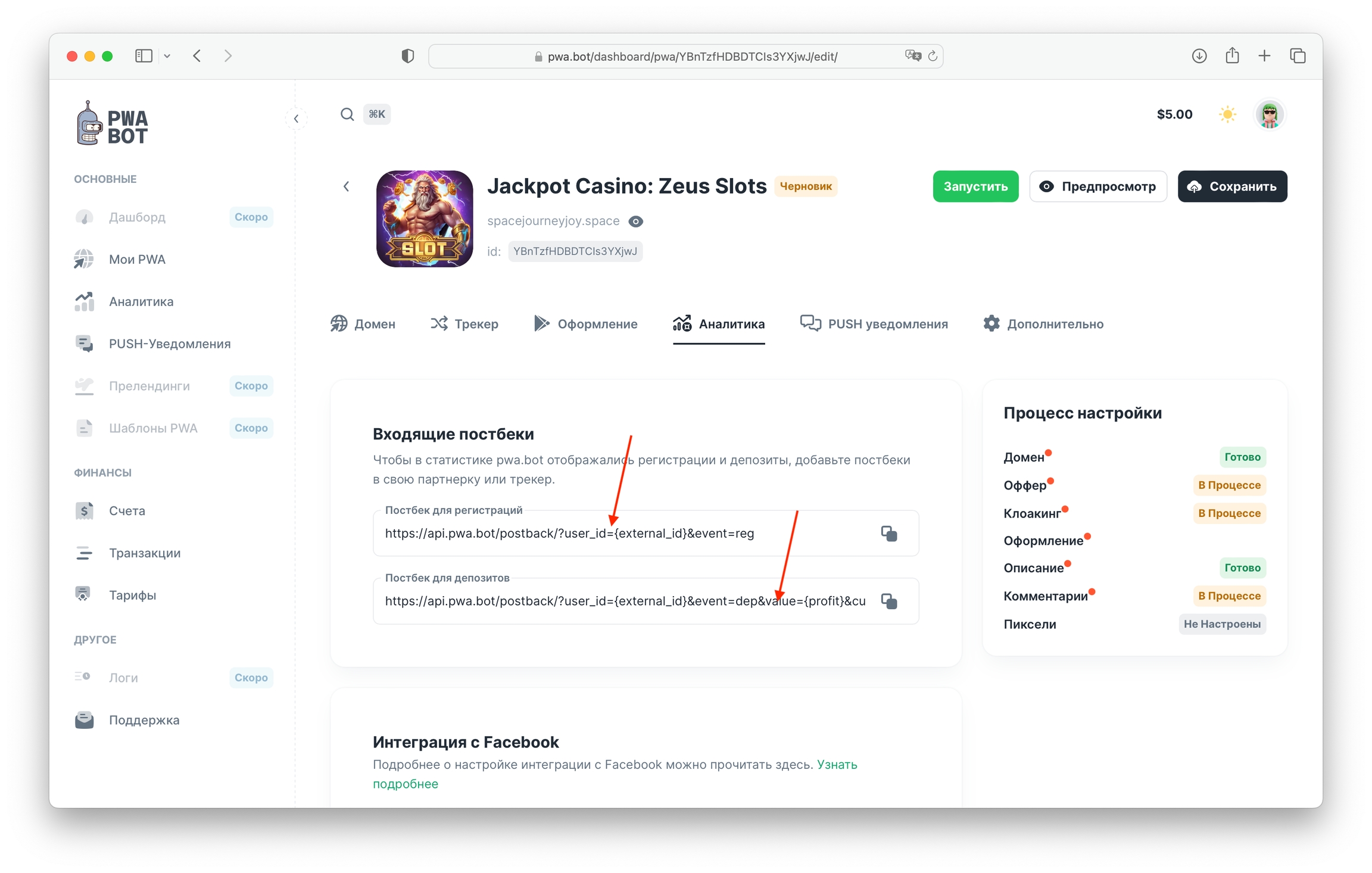 pwa.bot позволяет передавать динамические GET-параметры, преобразуя их ключи. Для этого нужно в фигурных скобках указать название нужного ключа, например, если в объявлении Facebook* указана ссылка: