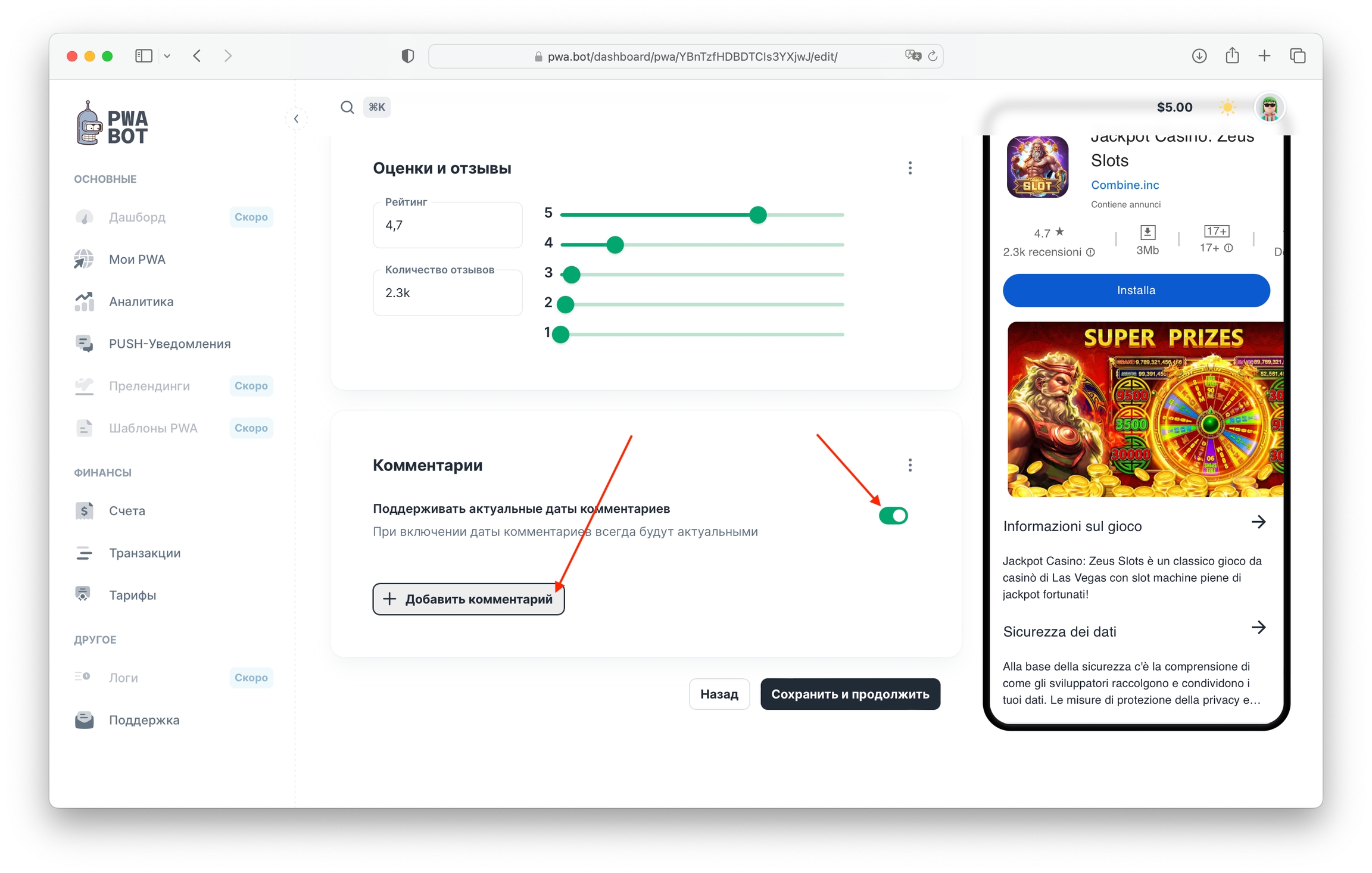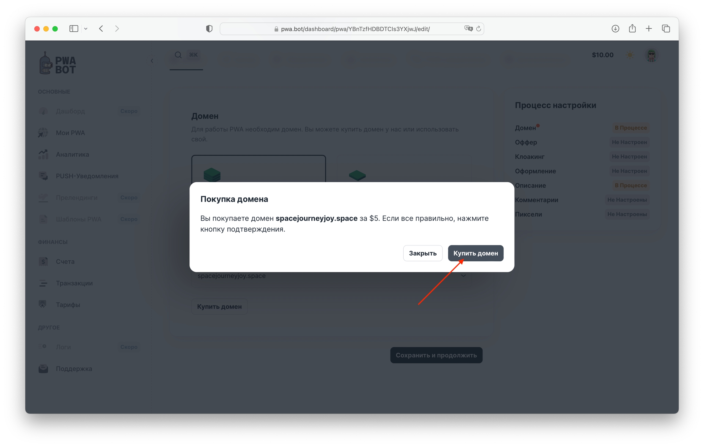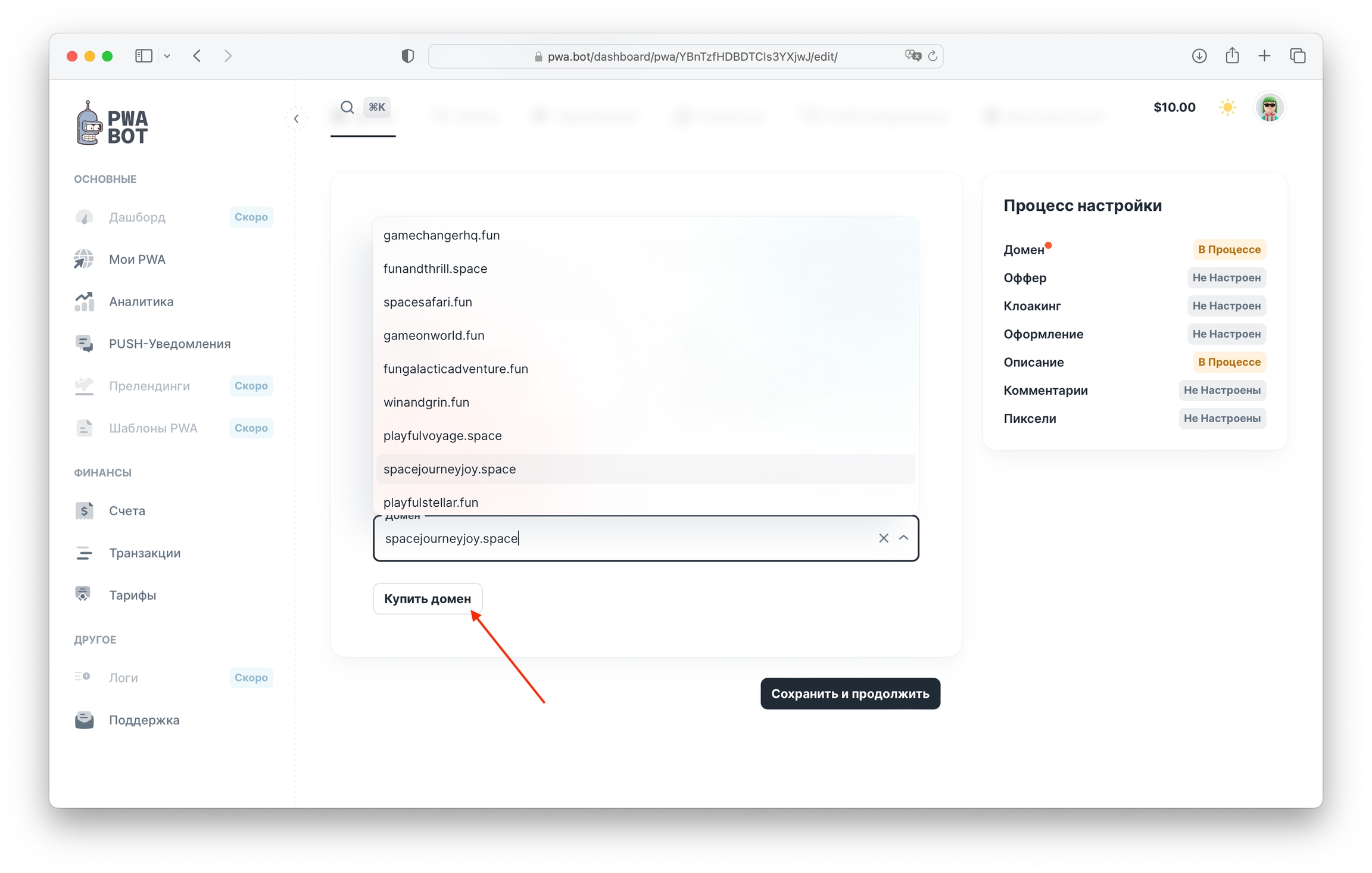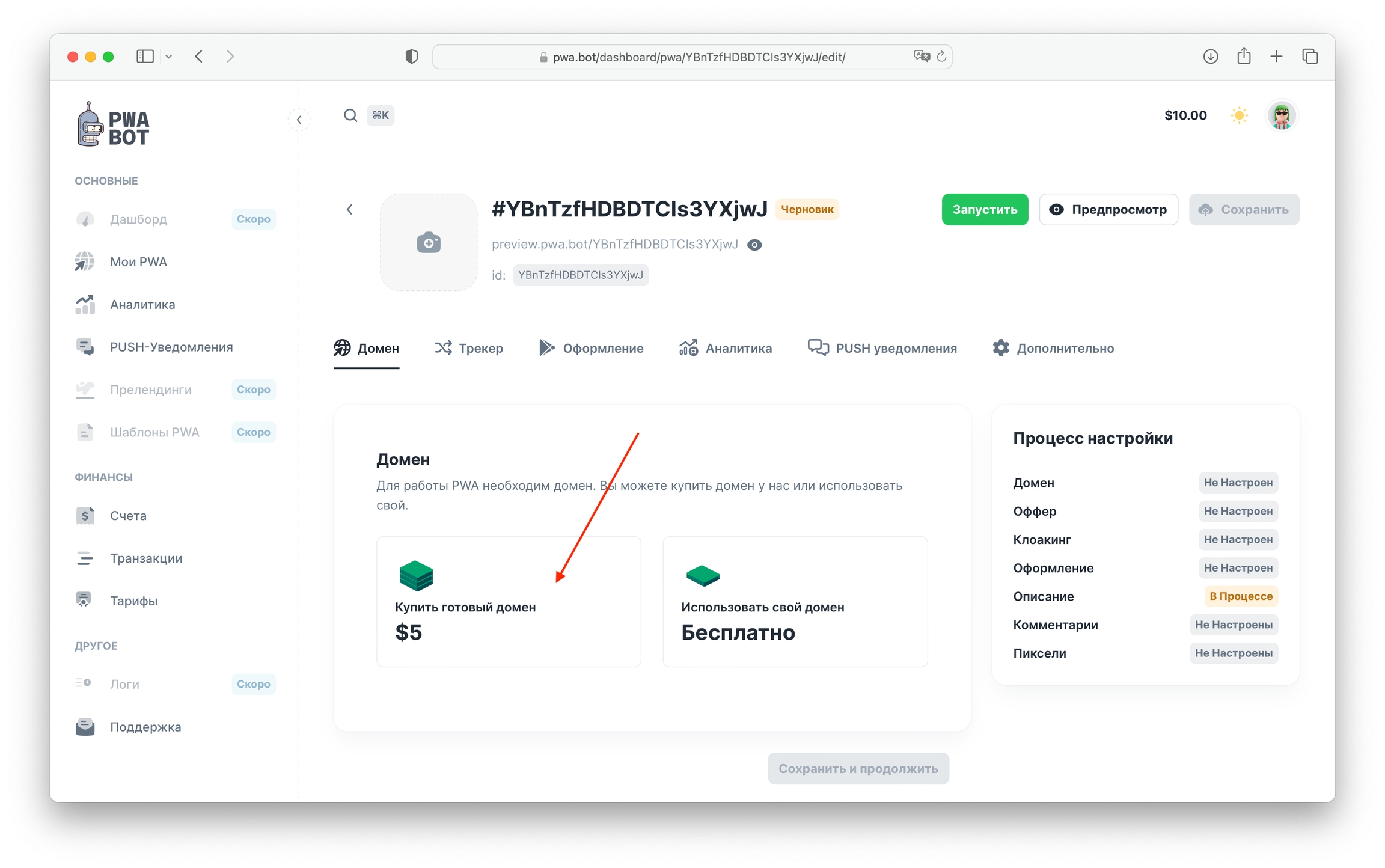 После чего, откроется страница создания/редактирования PWA. Нажимаем на Купить готовый домен.