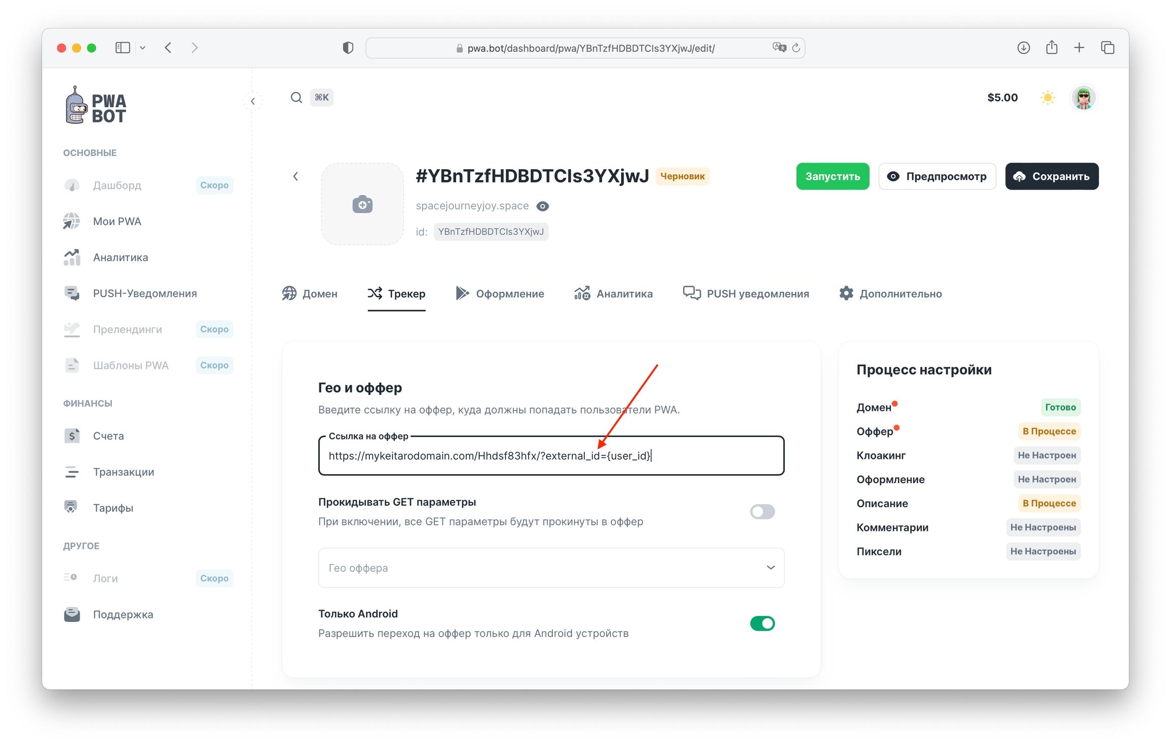 Для того, чтобы передать в Keitaro external_id нужно дописать в поле ссылки на оффер (в ЛК pwa.bot) дополнительный параметр external_id={user_id}. Именно так. С фигурными скобками.