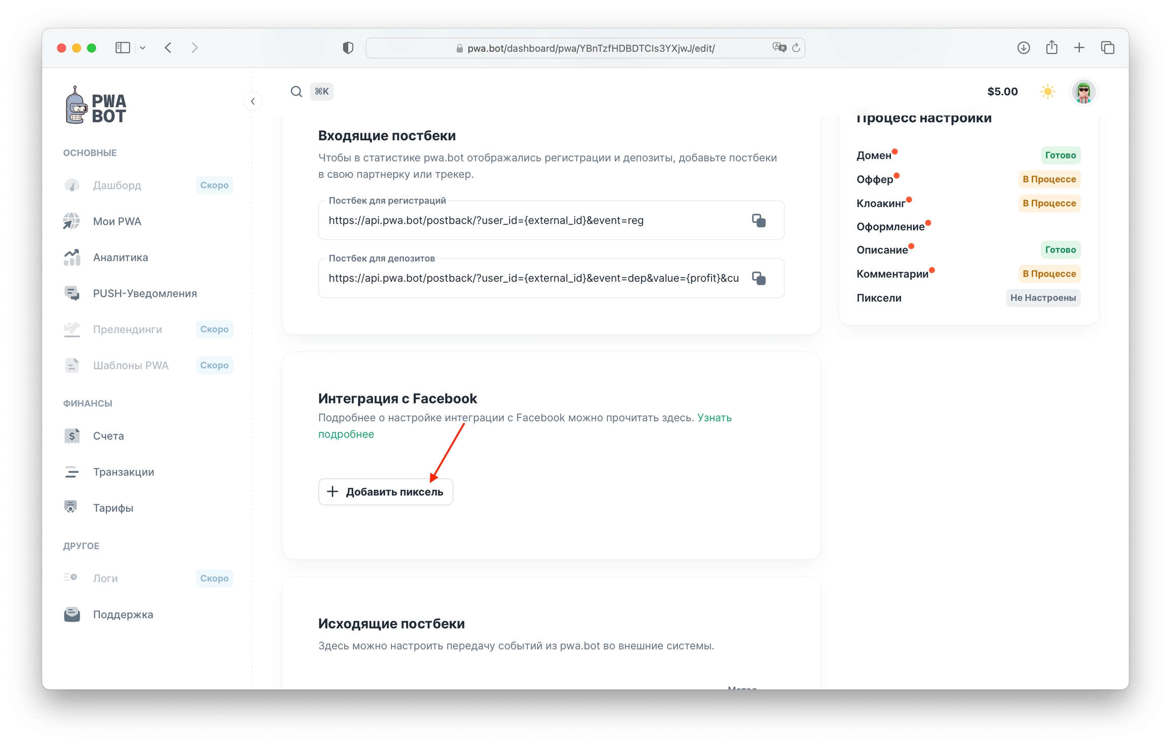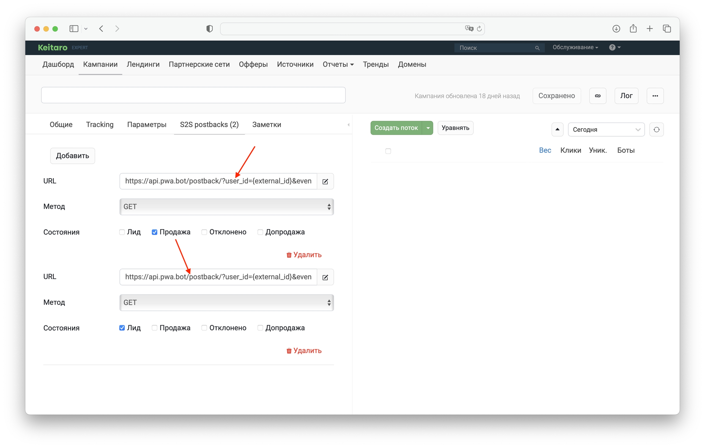 В последнем важном разделе находятся ссылки для постбеков, которые нужно вставить в Keitaro в (в настройках кампании S2S Postbacks), а также настройки пикселя Fb* (Meta*).