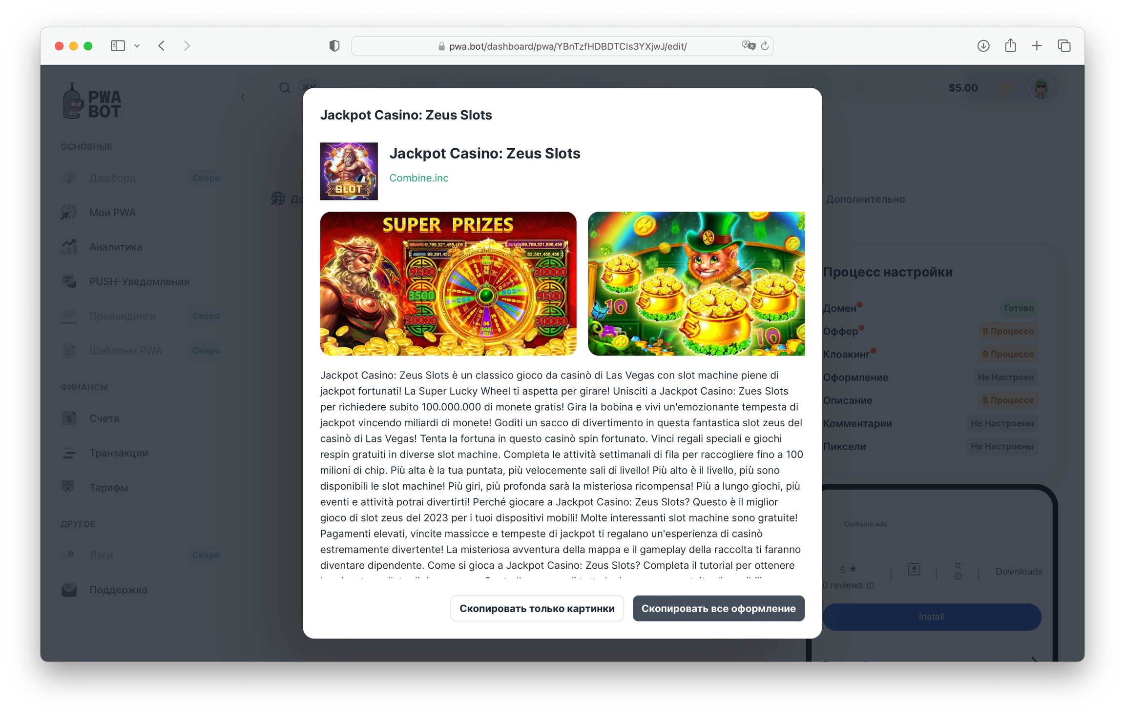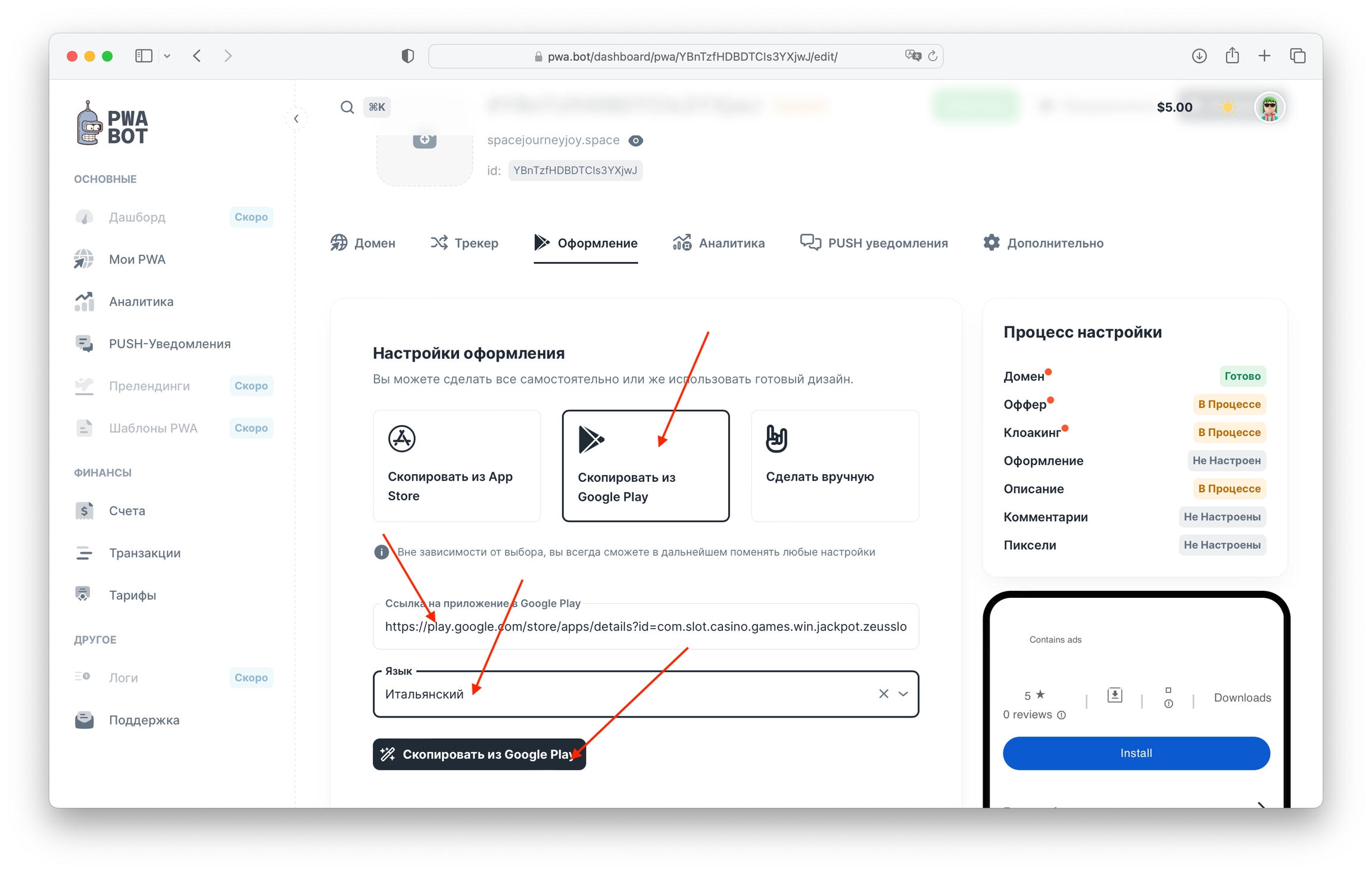 Самый простой и быстрый способ настроить оформление - это полностью скопировать уже существующее приложение из Google Play или App Store. Для этого достаточно вставить ссылку на прилу, выбрать язык и нажать кнопку Скопировать.