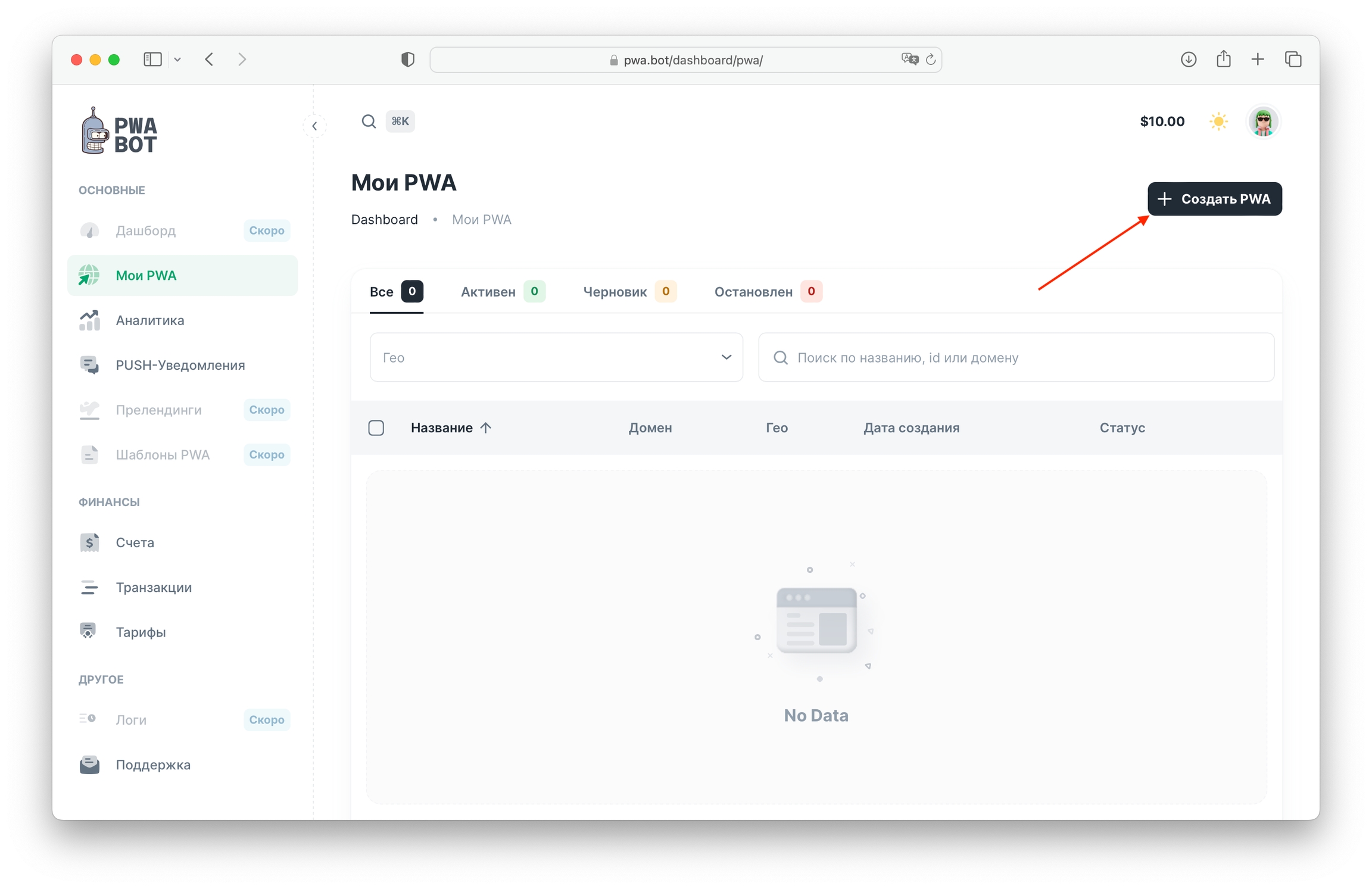 После первого входа в Личный кабинет, вы окажетесь на странице, где впоследствии будут отображаться ваши PWA. Но, сейчас их нет, поэтому нажимаем кнопку +Создать PWA.