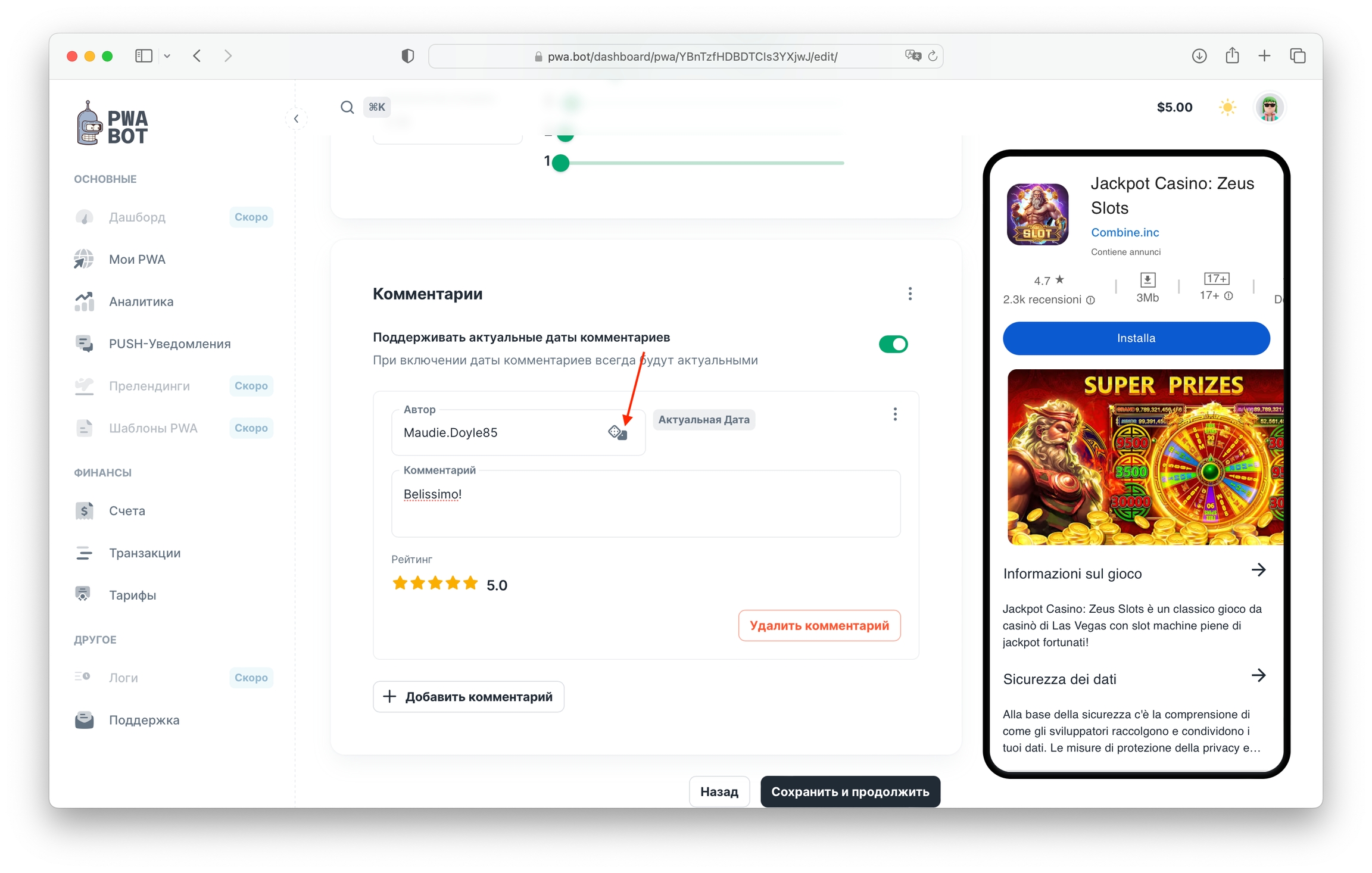 Теперь в оформлении осталось только добавить нужные восторженные комментарии. Это в самом низу этого же раздела. Нужно нажать на кнопку Добавить комментарий, выбрать имя (можно сгенерить случайное, нажав на "кубики" в поле ввода) и написать комментарий.