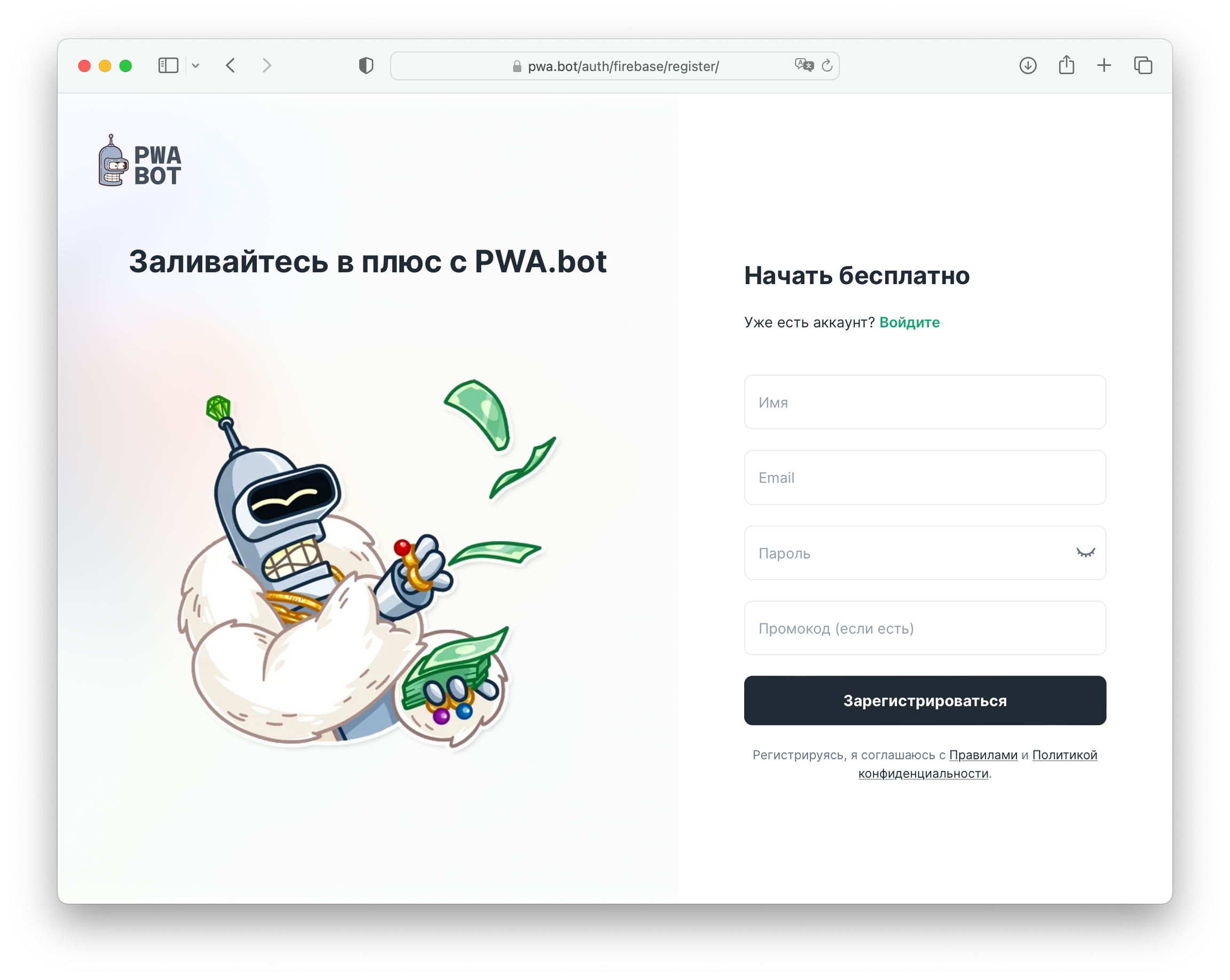 Чтобы зарегистрироваться, переходим на pwa.bot, нажимаем Зарегистрироваться, далее в форме вводим Имя, почту, пароль и промокод (если он у вас есть).