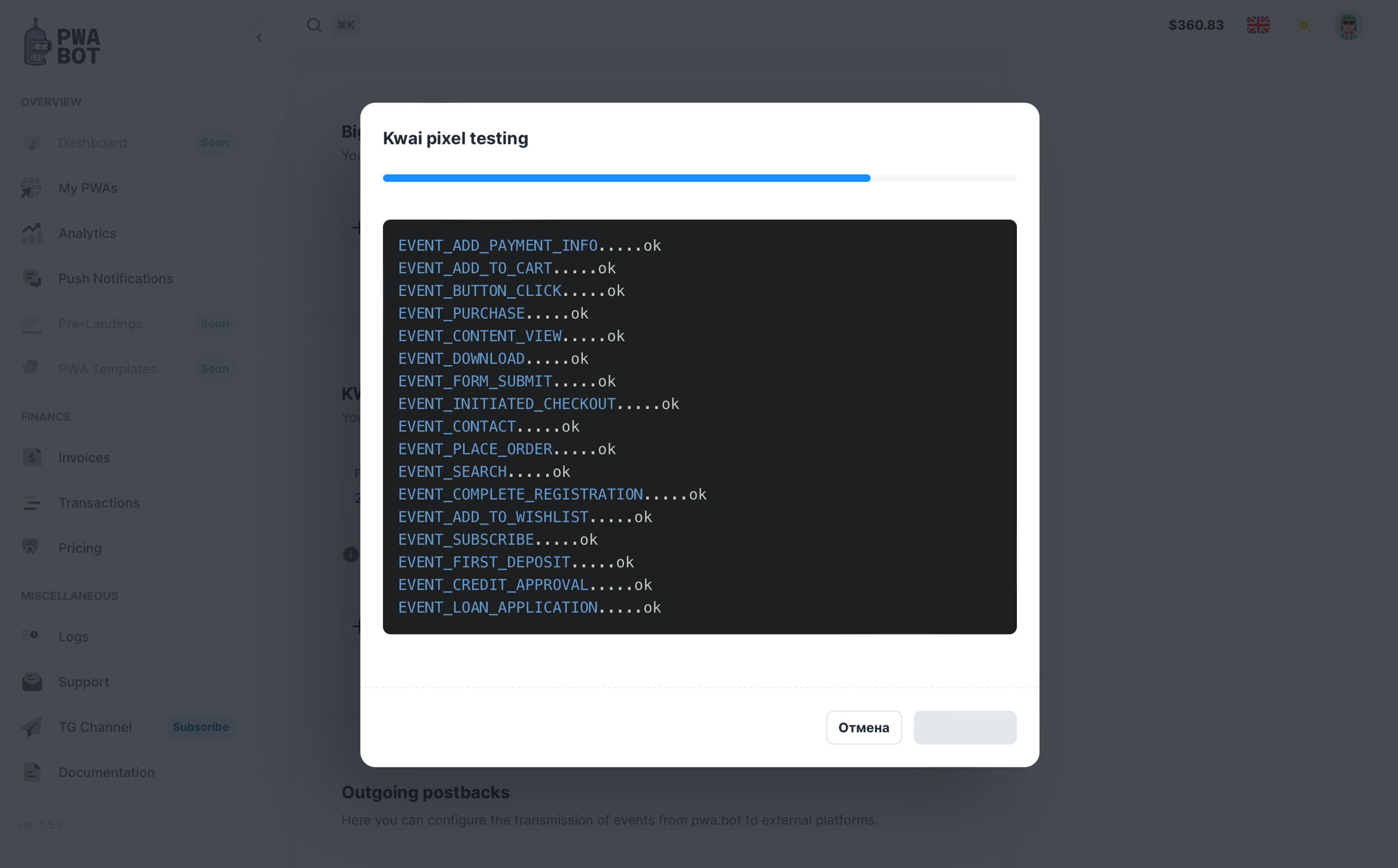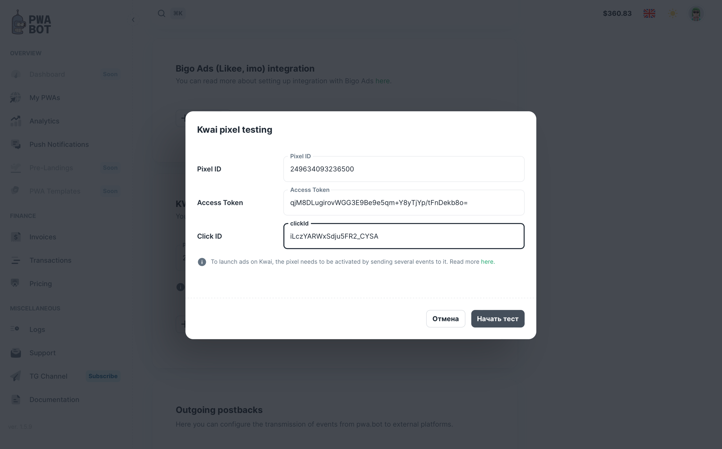На этом настройка завершена. Пиксель активен и его можно использовать в рекламных кампаниях. Не забываем сохранить настроки PWA в ЛК pwa.bot, чтобы реальные события отправлялись в Kwai.