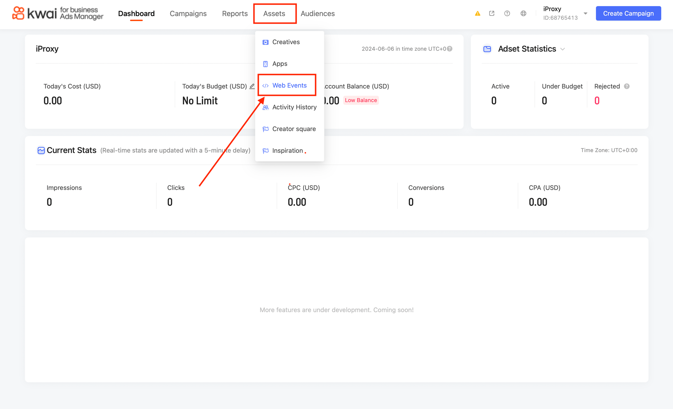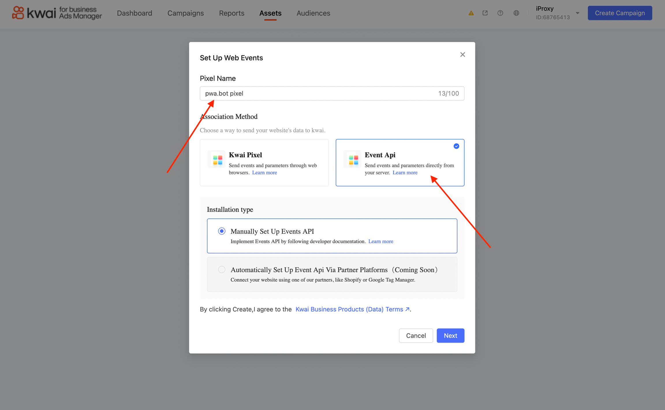 Чтобы создать пиксель перейдите в свой кабинет Kwai Ads manager https://ads.kwai.com