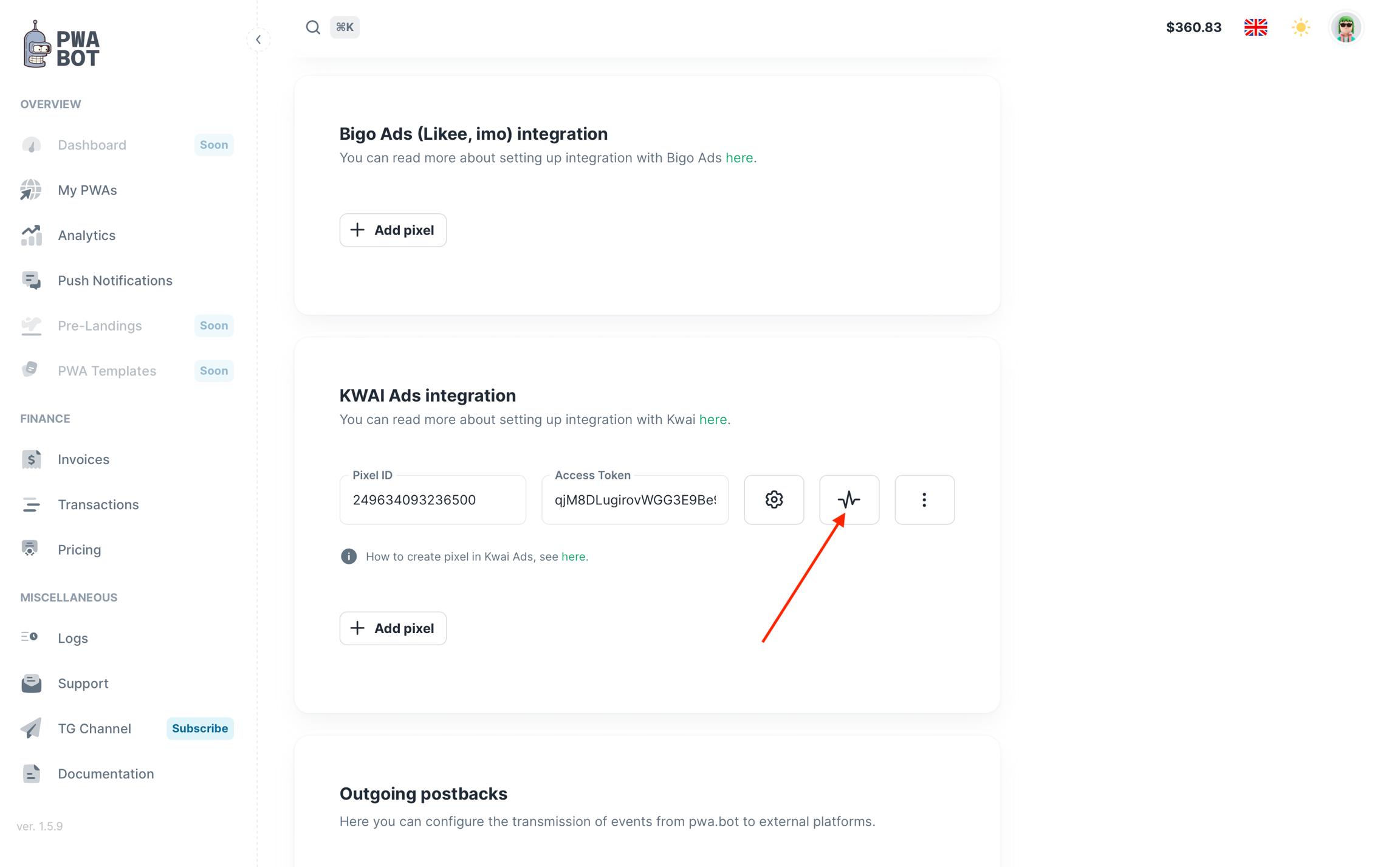 Переходим в ЛК pwa.bot, заходим в нужную PWA в раздел Аналитика. Листаем до Интеграция с Kwai Ads и вставляем в нужные поля ID пикселя и токен.