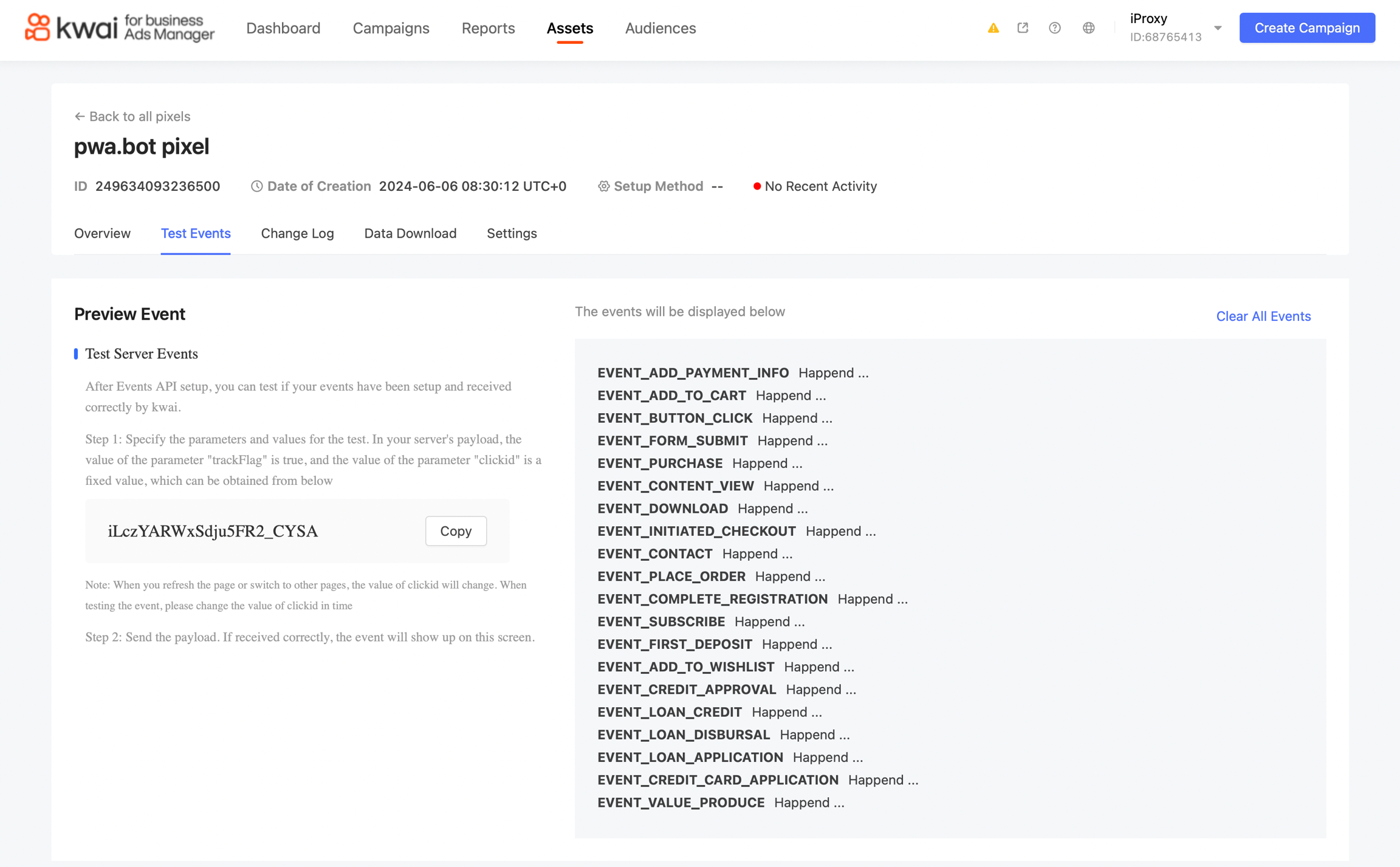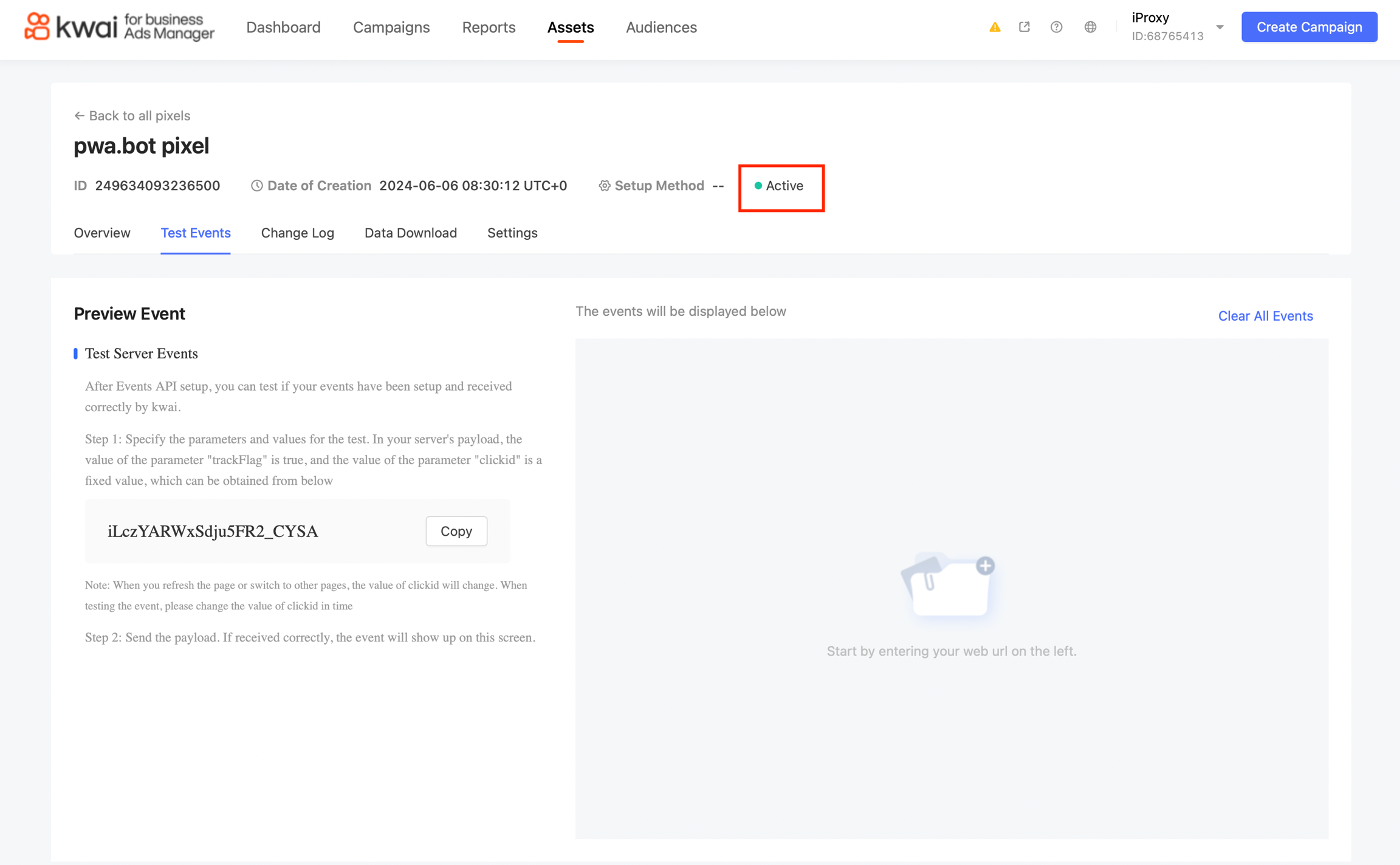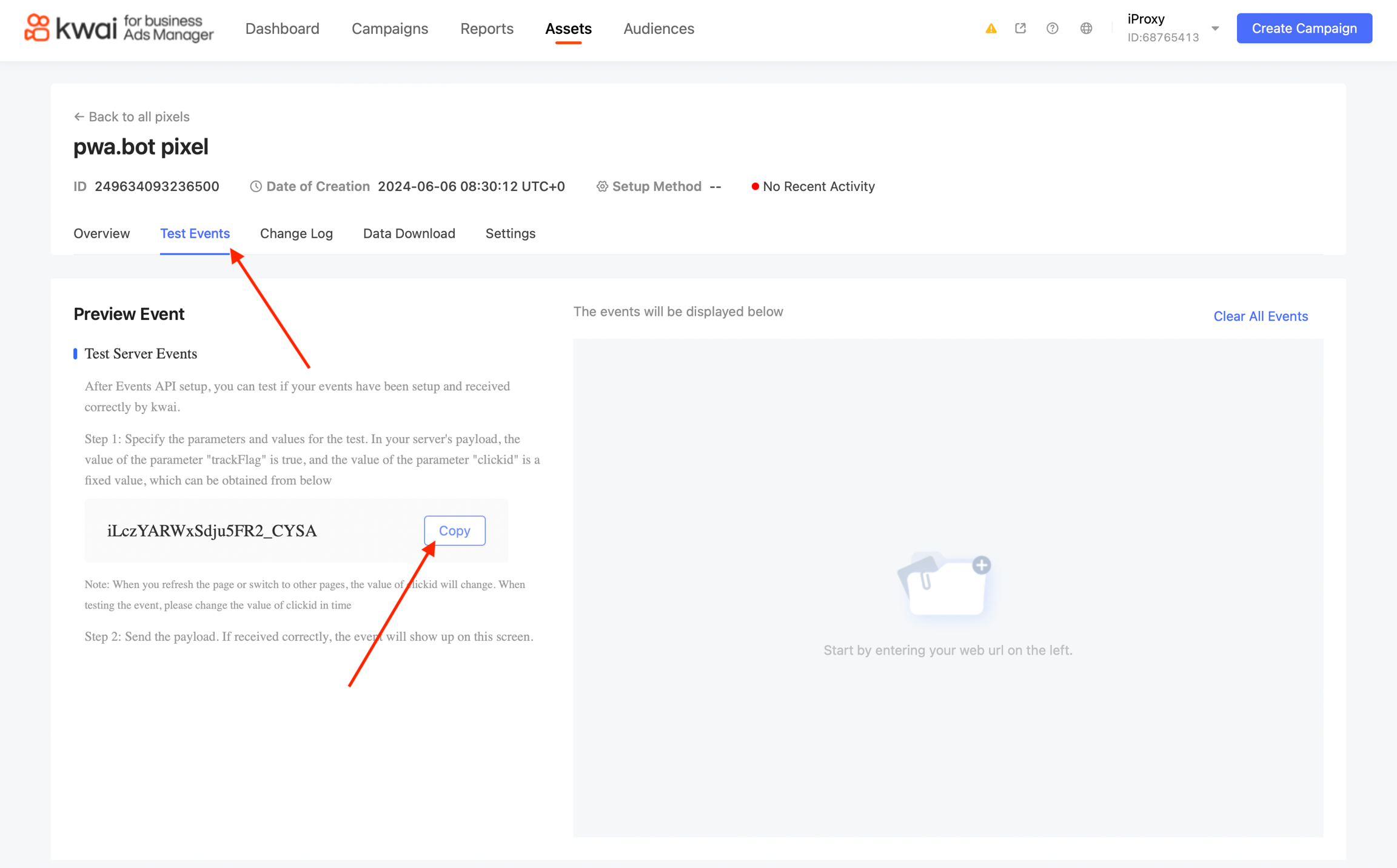 Возвращаемся в Kwai Ads manager в раздел Test Events. И копируем тестовый Click ID.