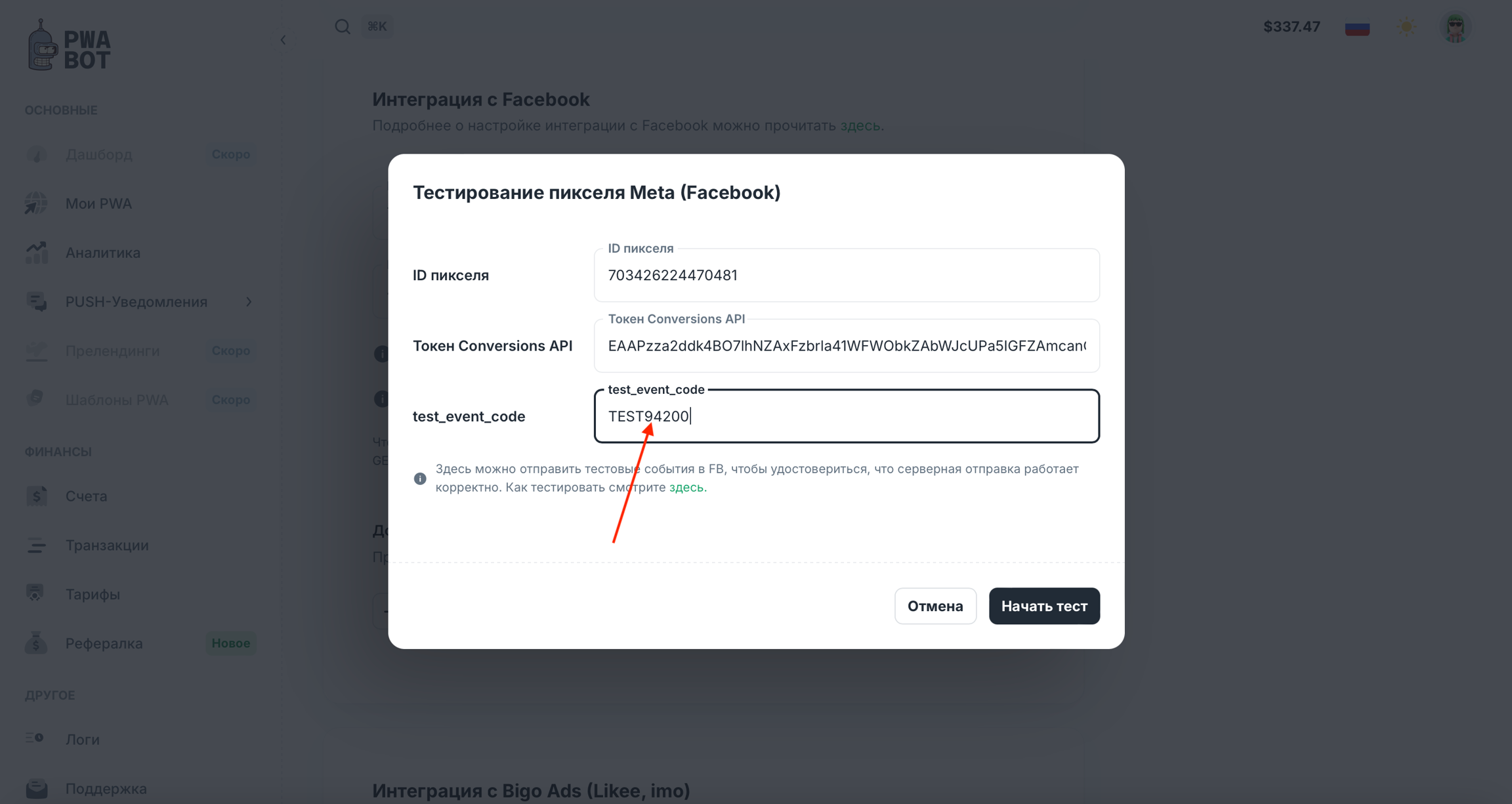 Окроется окно, в котором нужно вставить test_event_code, скопированный в Facbook на предыдущем шаге. Затем нажать кнопку Начать тест.