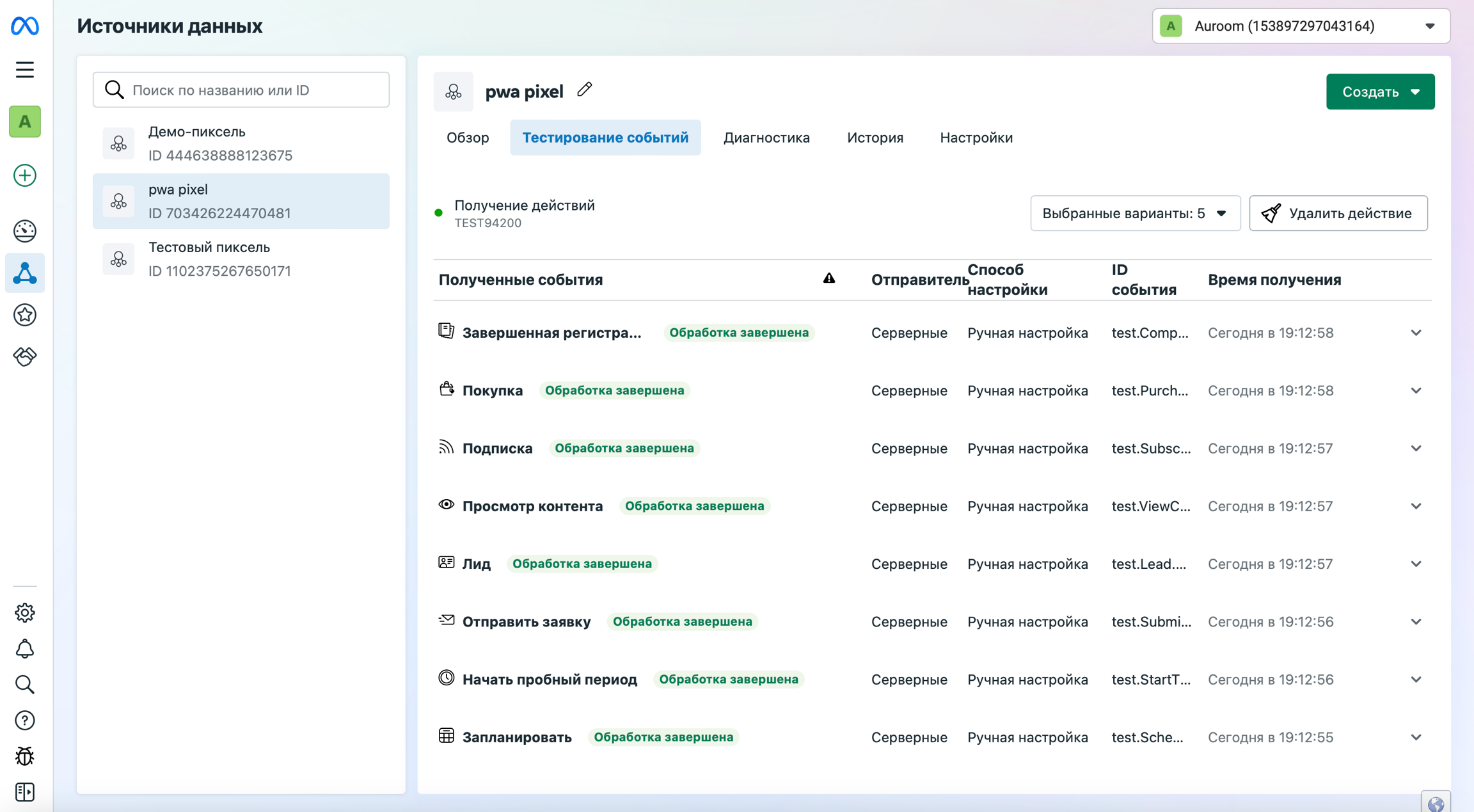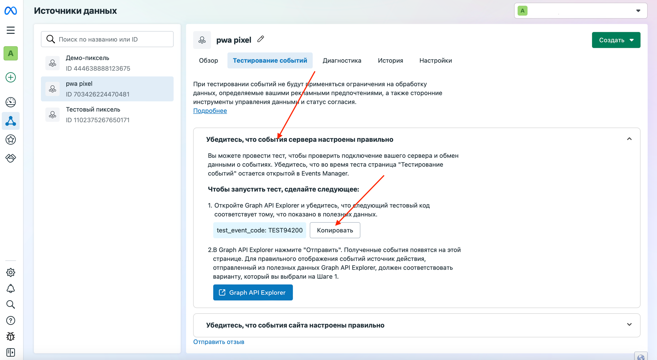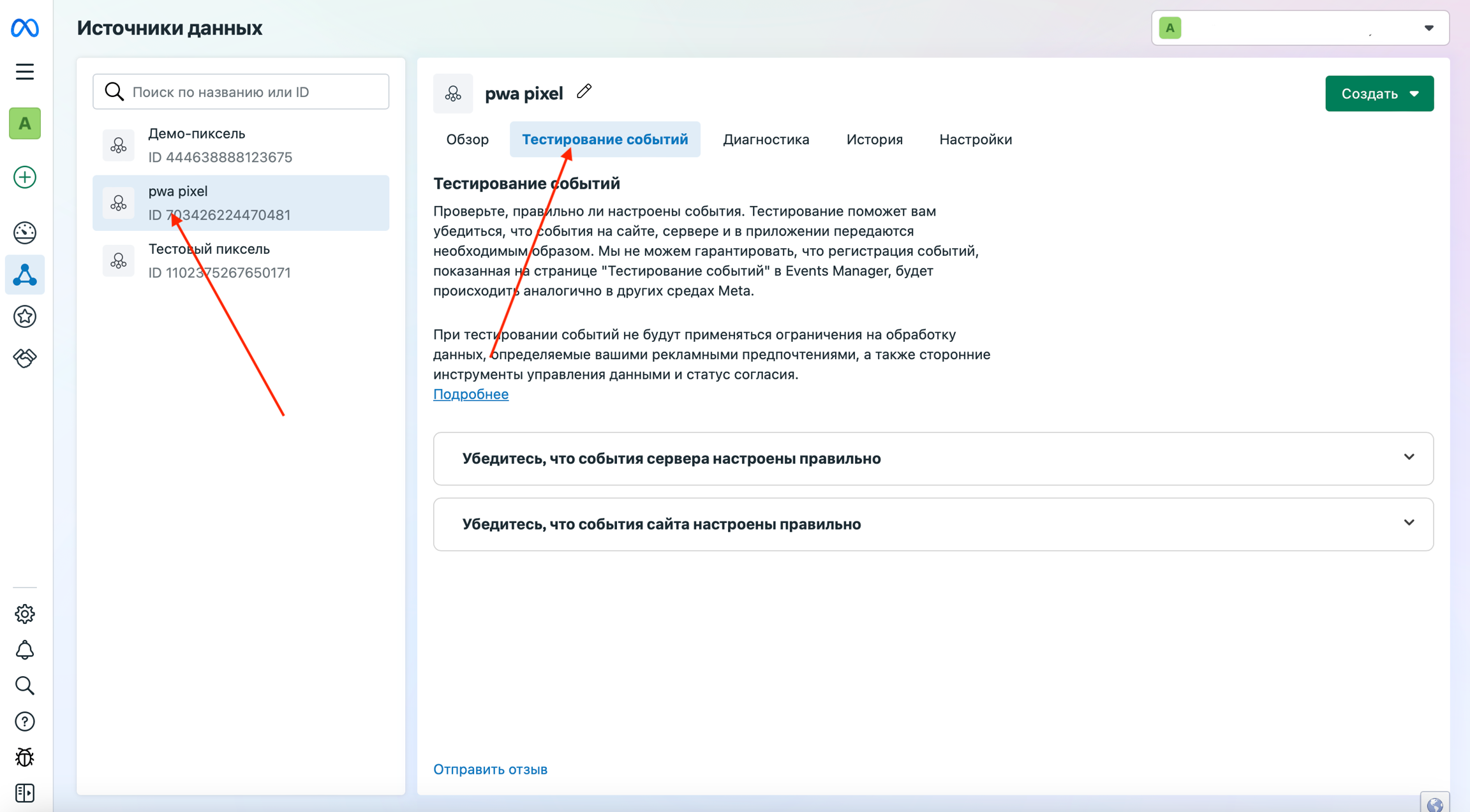 Перейдите в Events Manager в Источники данных, выберите свой пиксель и перейдите в раздел Тестирование событий.