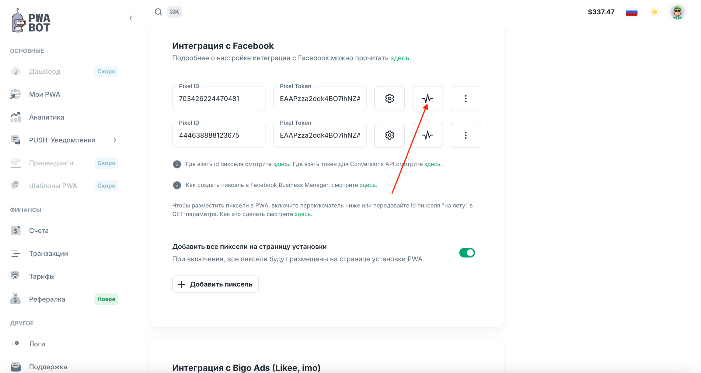 В настройках pwa во вкладке аналитика выберите кнопку Пульс у вашего пикселя.