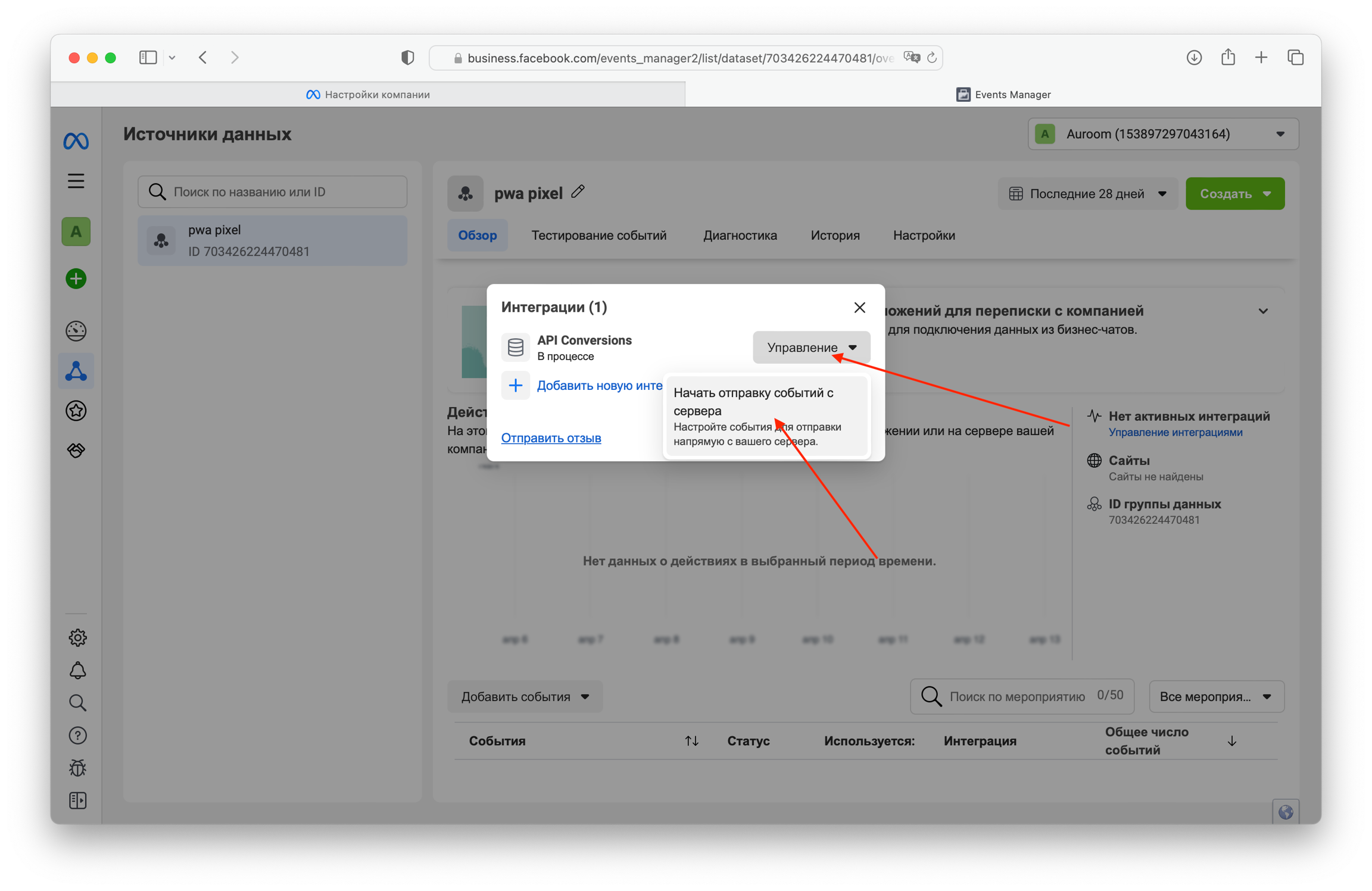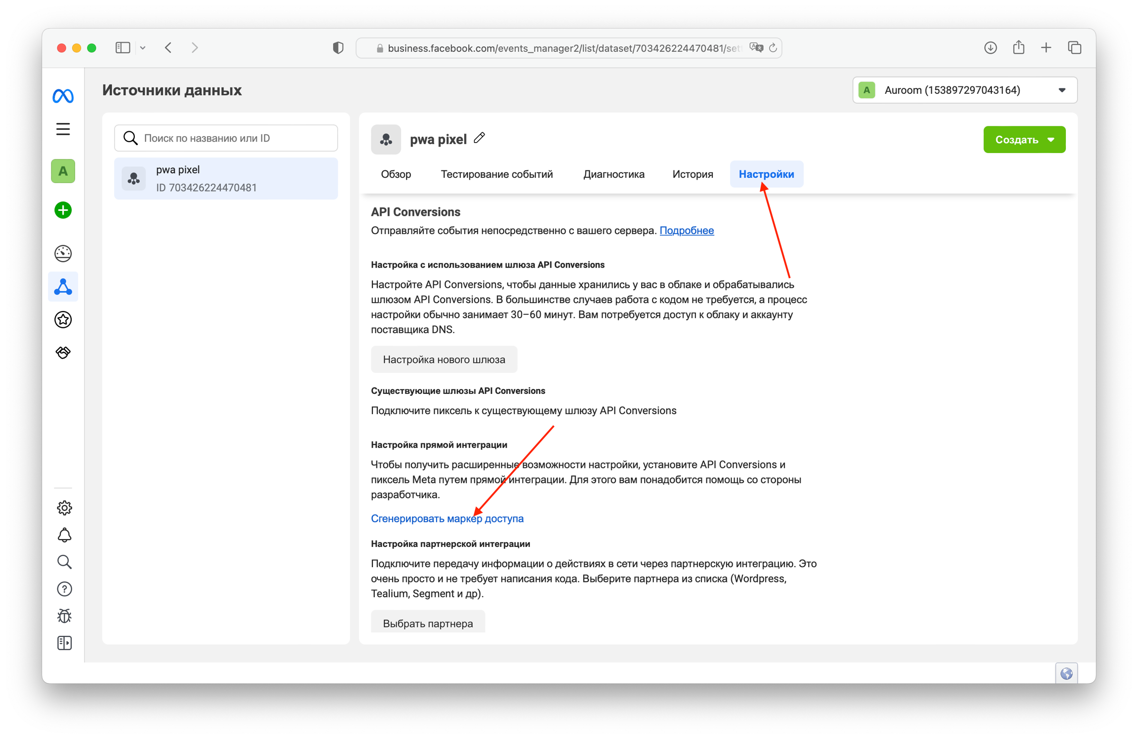 Предполагаем, что у вас уже есть БМ и в нем созан датасет (пиксель). Идем в Events Manager, потом в настройках пикселя создаем токен.