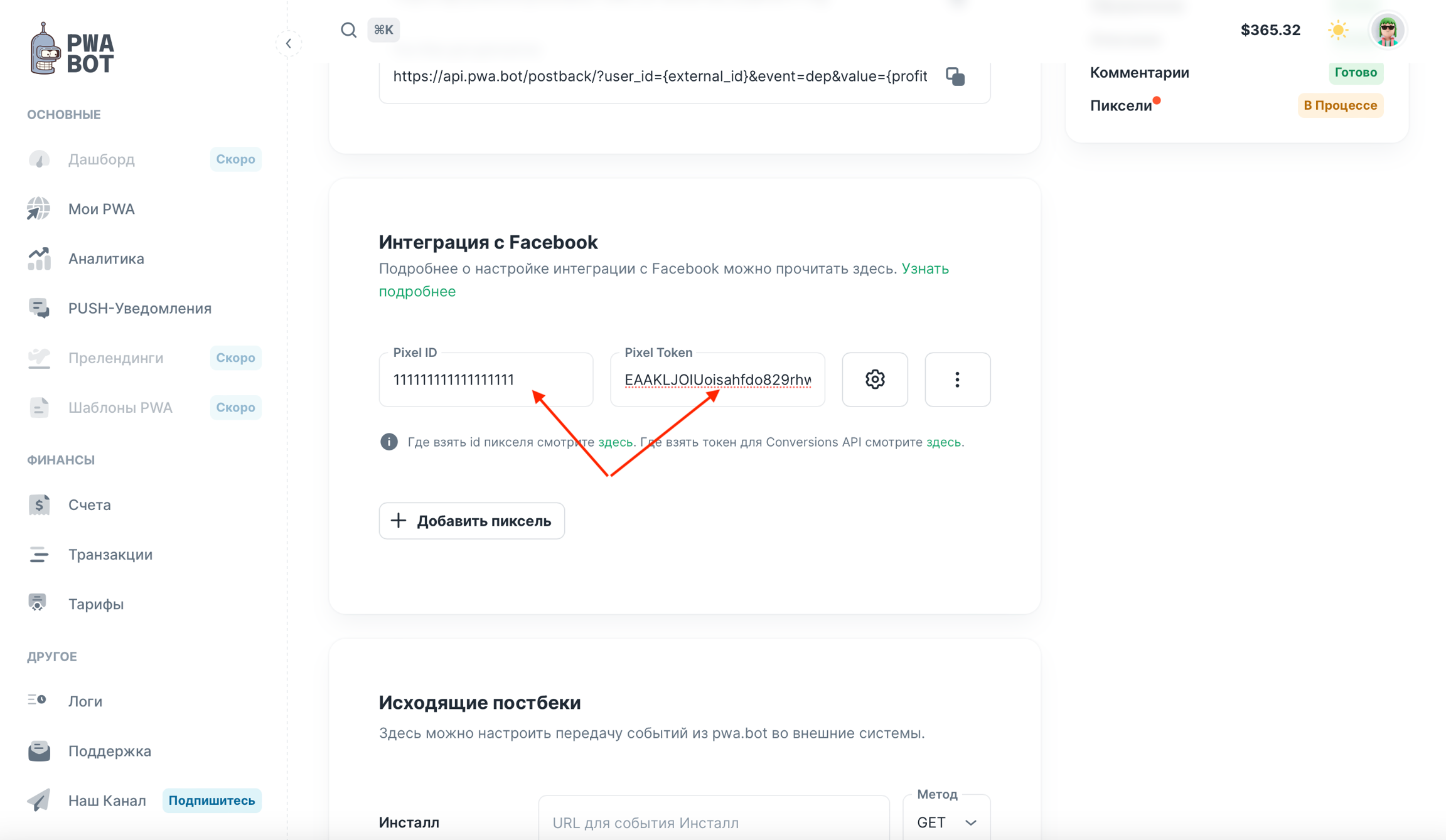 А затем вставьте id пикселя и токен в нужные поля.