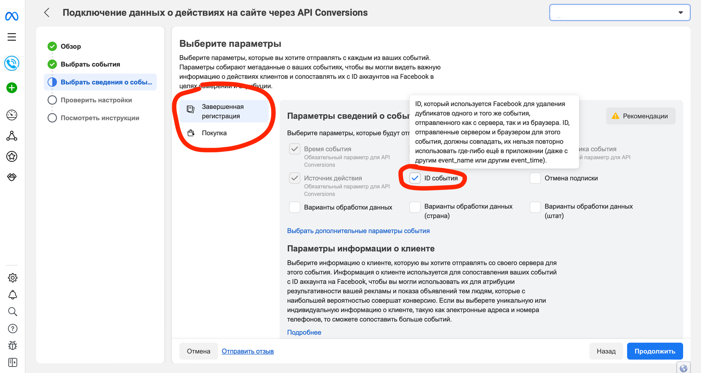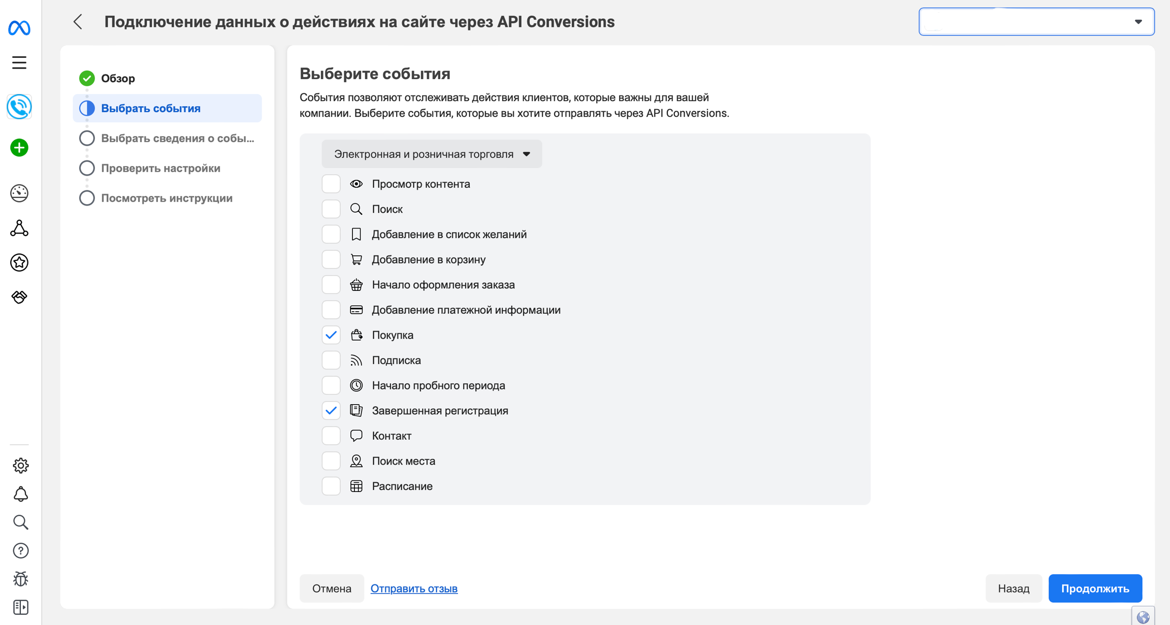 На следующем шаге выберите события Завершенная регистрация и Покупка