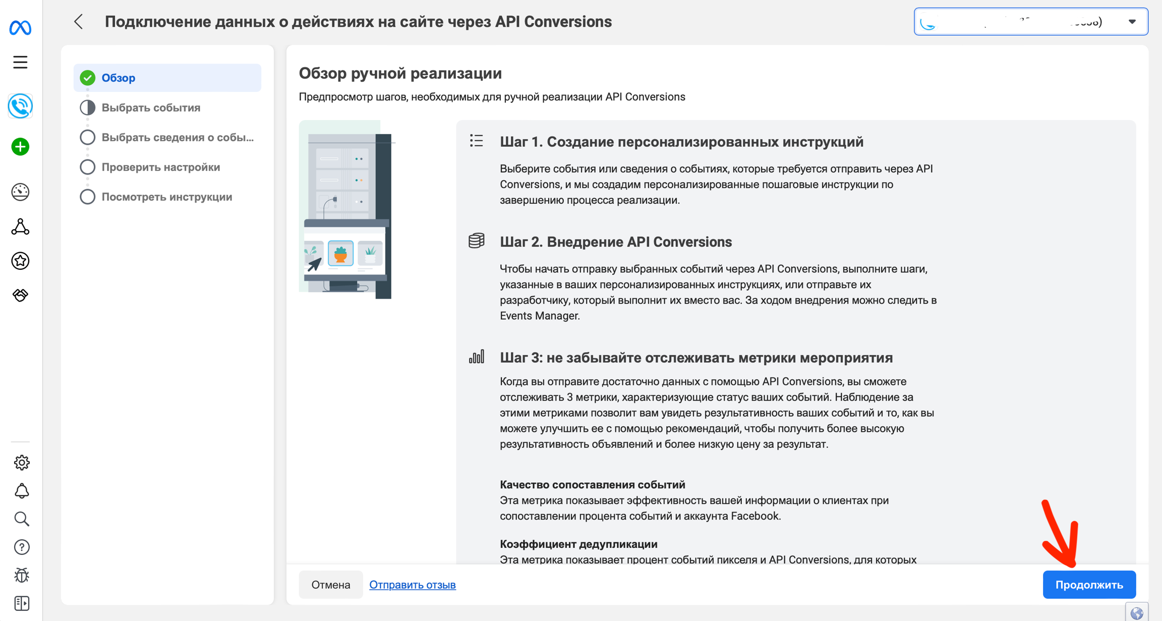Либо на главной странице пикселя в Events Manager, нужно добавить интеграцию через Conversions API.