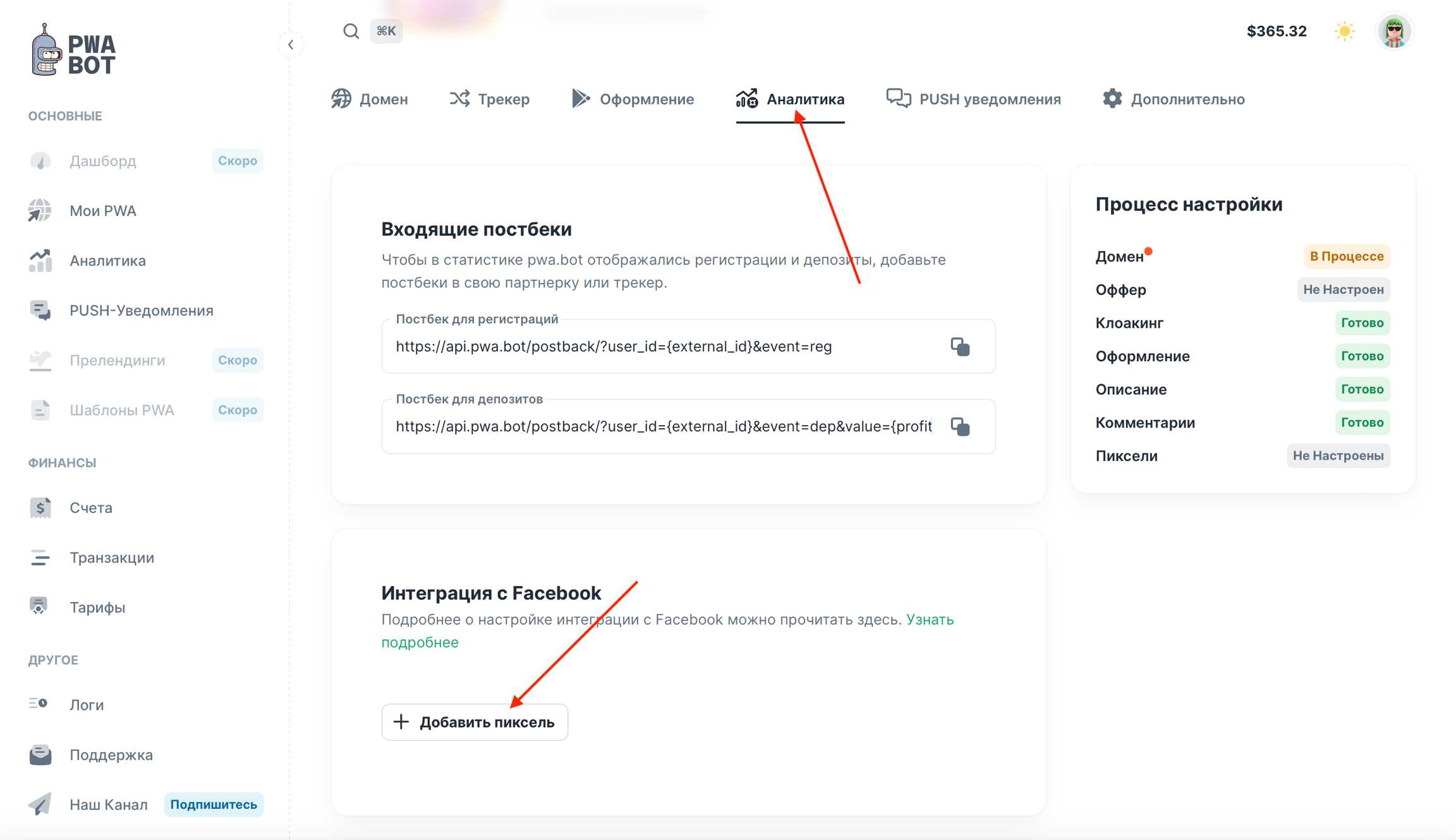 В ЛК pwa.bot в разделе Аналитика нажмите Добавить пиксель.
