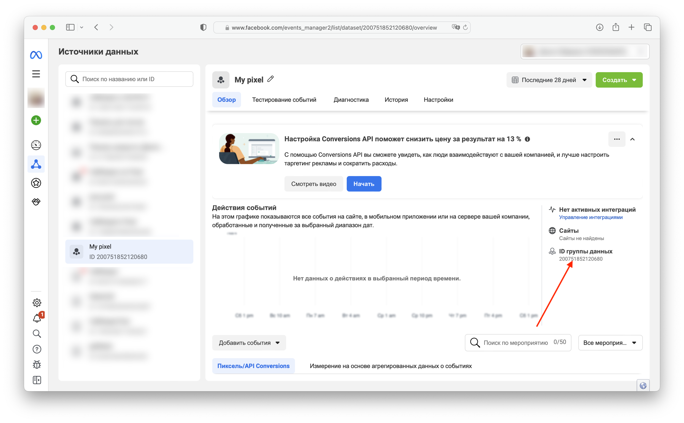 Идем в Events Manager, выбираем Источники данных, затем нужны пиксель и кликаем по id группы данных. Это и есть нужный id.